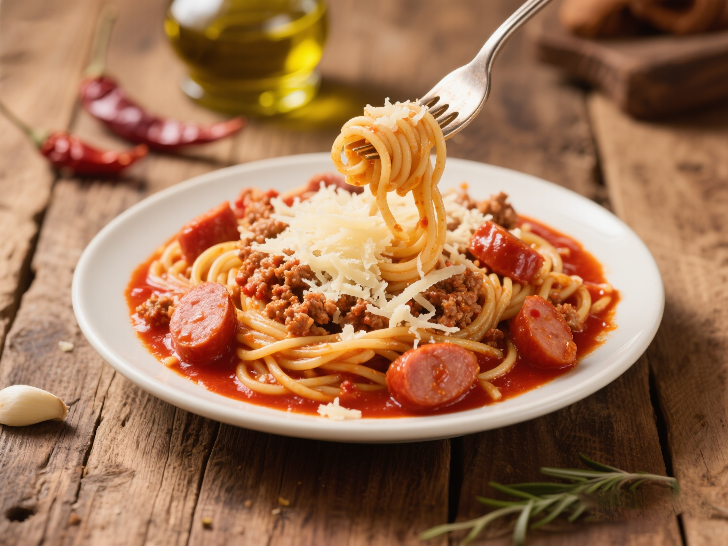特點(diǎn): 香腸油脂融入番茄醬汁,辣味激發(fā)肉香