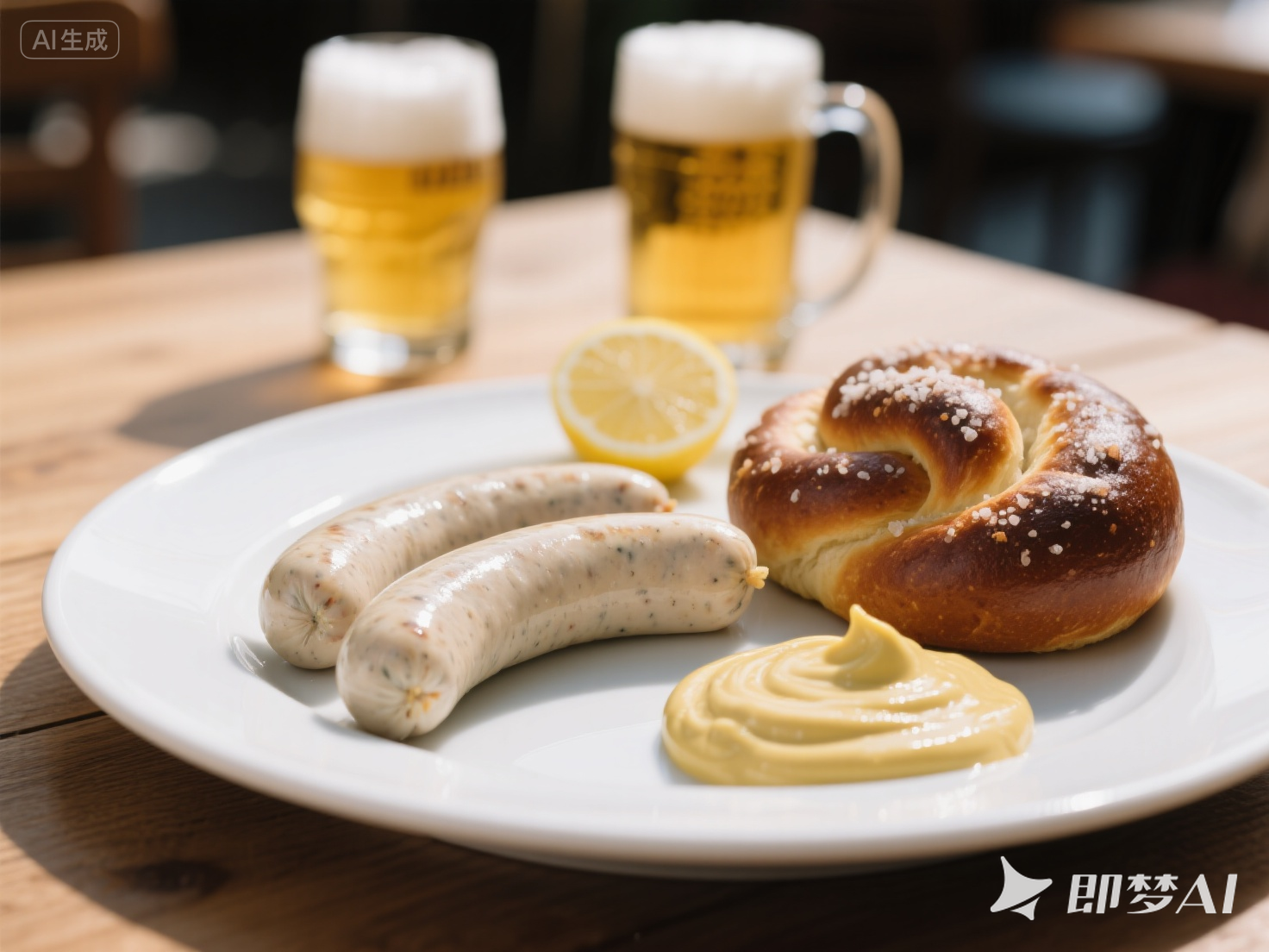 ⑤ 搭配: 旁邊放上一大碟巴伐利亞甜芥末醬、一個(gè)巨大的扭結(jié)包和一角檸檬。