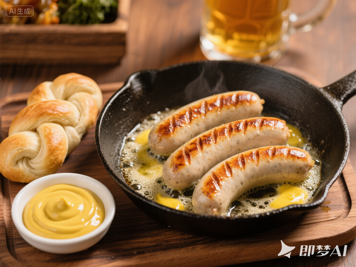 ③ 組裝拼盤: 將煎好的香腸、扭結(jié)包(或烤脆的酸面包)、一碟甜芥末醬和一碟酸椰菜一同擺入盤中。