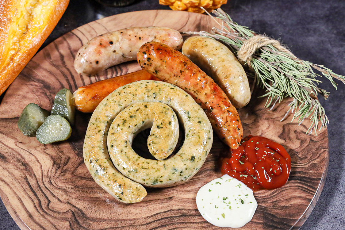 拼盤(pán)包含:德式香蔥油煎盤(pán)腸、圖林根香腸、龍戈尼茲香腸、牛肉奶酪香腸、羅勒葉香腸
